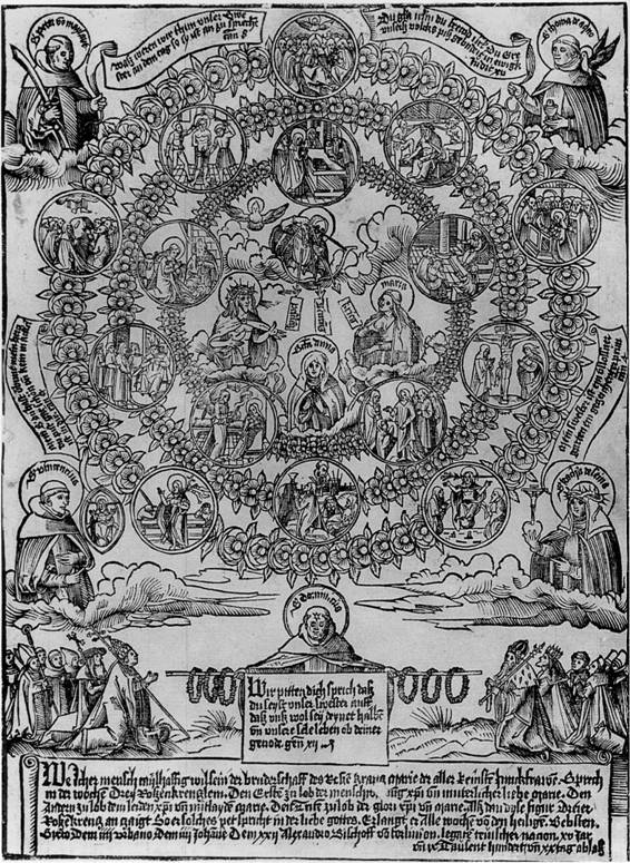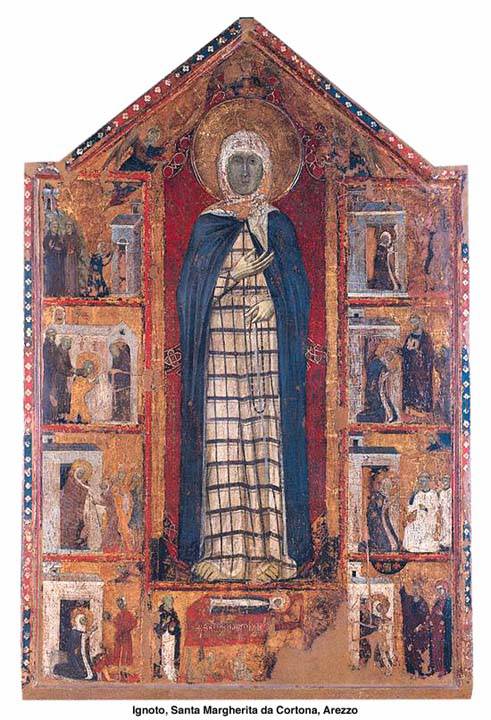 FIGURA TЁ ZGJEDHURA ZOJA RRUZARE DHE I LUMI ALANO I RUPES (Beatus Alanus de Rupe, B. Alain de la Roche) TREGIM ME IMAZHE QYTETET KU KA KALUAR I LUMI ALANO I LUMI ALANO I RUPES ORIGJINA DHE PЁRHAPJA E RRUZARES Lindja e Rruzares ka njё datё tё caktuar, shfaqja e Zojёs Shёn Domenikut nё Tolosa tё Francёs, nё vendin nё tё cilin tani ngrihet njё kishё e mrekullueshme me njё kishёz tё Rruzares. I lumi Alano (pjesa II, kap. III) tregon qё ndёrkohё qё Shёn Domeniku, i shtrirё pёrtokё pёr shkak tё herezisё sё albigjezёve, i kёrkonte Zojёs me tёrё zemrёn njё lutje qё mund tё fitonte tё keqen. Zoja ju shfaq e i tregoi kurorёn prej 150 trёndafilave me 15 zambakё dhe i thotё atij qё me atё armё tё pamposhtur, gjithçka qё do t’i kёrkonte, do t’i jepej. Kjo shёnoi lindjen e heshtur por zyrtare tё Rruzares, rreth vitit 1212. Autor anonim, Shёn Domeniku i Guzmanit Kisha Shenjtja Mari e Rruzares nё Prati, Romё Imazhe tё ndryshme tё Shёn Domenikut Michelangelo Bonocore, Virgjёra Mari i shfaqet Shёn Domenikut, pikturё vaji nё kanavacё, L'Aquila, Kisha e Shёn Domenikut (1733). Nё kёtё skenё tё Zojёs Mari qё e ushqen me gji Shёn Domenikun, ёshtё e pёrfaqёsuar skena e pёrshkruar nё vizionet e tё Lumit Alano, qё ndodhi nё tё njёjtёn ditё nё tё cilёn Zoja i dha Rruzaren Shёn Domenikut. ёshtё e lehtё qё tё deduktojmё qё Rruzarja ёshtё qumёshti i gjirit, dhe Zoja e Hireve ёshtё e Virgjёra qё ushqen me gji tё gjithё fёmijёt e saj rruzarianё. Michelangelo Merisi Da Caravaggio, Zoja Rruzare, 1607, Kunsthinstorisches Museum, Vjenё. Shёn Domeniku merr nga Zoja Mari mandatin qё tё pёrhapё Rruzaren Domenikani tjetёr qё tregon me gisht drejt Zojёs ёshtё Shёn Pjetri Martir detaj: dhurata e Rruzares besimtarёve Imazh i fillimit tё viteve ‘900 Shёn Domeniku dhuron Rruzaren. QЁ ATЁHERE RRUZARJA DOLI NЁ TЁ GJITHA VEPRAT E ARTIT: a) nё momentet e funeraleve Jean de Marville, Varri i Philippe le Hardi, Musee des Beaux atrs, Dijon, Francё 1383-1412. Varri i Ines di Castro, Monasteri i Shenjtes Mari, Alcobanca, Portugali, shek. XIV Varri i Monna Tessa (+1327). Firenze, Kisha Sant'Egidio. Nё bel shikojmё qё varet njё kurorё e Rruzares. Gur varri i Monna Lapa degli Acciuoli, nё Buondelmonti, Certosa di Firenze, rreth 1370. Ndёr duart e Monna Lapa vёrejmё njё kurorё tё madhe tё Rruzares, ku Ati ynё dhё tё Falemi Mari janё tё ndara nё mёnyrё dukshme Lorenzo Orengo, Monument i funeralit, Campo Santo di Staglieno, Genovabr> ----------------- b) nё artin figurativ Margaritone D'arezzo, Pikturё me episodet e jetёs sё Shenjtes Margherita di Cortona, fund shek. XIII, Muzeu Diocesan i Cortona. Ndёr duart e Shenjtes Margherita mund tё shikojmё njё kurorё tё madhe tё Rruzares. Shenjtja Margherita, terciare domenikane, themeloi nё Cortona Vёllazёrinё e Laudit, ndёr dёshmitё e para historike tё pёrhapjes sё shpejtё tё Rruzares Dorёshkrim Mediceo Palatino, folio 121r, miniaturё e v.1401, Firenze, Biblioteka Medicea Laurenziana, cod. XI. Lorenzo i Pjetrit i quajtur il Vecchietta, Arliquiera, detaj, Sienё, Galeria e Fotografive Kombёtare, viti 1445. Nё duart e tij mund tё shikojmё kurorёn e Rruzares. Jan Van Eych, Poliptik i Qengjit, detaj i vetmitarёve, Gent, Kisha e Shёn Bavone, 1432. Nё duart e vetmitarёve mund tё shikojmё kurora tё Rruzares. Tiepolo i Gjon Pagёzuesit, Themelimi i Rruzares, 1739, Kisha e Shenjtes Mari tё Rruzares (Gesuati), Venezia. Rruzarja i dorёzohet nё Tolosa tё Francёs Shёn Domenikut nga Zoja dhe kjo bёn qё tё bien nga shkallёt heretikёt albigjezё. Beatus Franciscus de Paula, Printim, rreth 1513. Bicci Di Lorenzo, Portret i Gerardo di Villamagna, gjysma e parё e 1400 A. Durer, Portret i njё njeriu qё lutet, 1490 Joos Van Cleeve, Portret i njё gruaje, 1527 Hans Baldung Grien, Burrё me Rruzare, 1509 Njeri qё lutet… Hans Von Wertiger, Njeri qё lutet, Boston, Museum of Fine Art, gjysma e parё e shek. XVI ……… Maria e Skocisё, 1478. Josč Alcibar, Portret i Maria Josefa duke dhёnё betimet, 1793 detaj i njerёzve qё luten Imazh devocional i Shёn Pasquale Baylon Master of Flemanne, mérode altarpriece, 1427 P. Cezanne, La vieille au chapellet,1898 Joos Van Cleeve, largimi i sё Virgjёrёs, 1520 Induno Domenico, Grua e vjetёr me Rruzare, …. Zoja Rruzare, Köln, Kisha e Shёn Andreas, 1623, detaj i pikturёs para restaurimit Figurё e njё shenjti Miniaturё: Artizan qё fabrikon rruzare, Hausbuch, Stadbibliotheck i Norimberga Njё ilustrim i legjendёs sё murgut: "Der spiegel Hochlobligher Brudershafft des Roserkrantz Marie" Shenjtja Mari Madalenё, 1530, Museu Arcipershkvor i Utrechtit xilografi, fillimet e1500 Prezantimi i Jezusit nё Tempull. Nё duart e Shёn Jozefit shikojmё njё kurorё tё madhe tё Rruzares ----------------- c) profetёt e mёdhenj tё sё Shenjtes Rruzare Bartolo Longo bёri nё nder tё Zojёs sё Rruzares Shenjtёroren e Mrekullueshme tё Pompeit Fatima, tre barinjtё, 1917 -------------- d) disa nga Papёt e mёdhenj tё Rruzares Papa Sisto IV, bashkёkohor i tё Lumit Alano, bёri demat e para papale mbi Rruzaren dhe Vёllazёrinё e Rruzares Shёn Pio V, e ngriti rruzaren nё nivelet mё tё larta, sidomos pasi pa nё ёndёrr qё ishte Zoja e Rruzares qё lejoi Fitoren e Betejёs sё Lepantos Gjon Pali II, apostull modern i sё shenjtes Rruzare Me Papa Benedikti XVI Kisha vazhdon rrugёtimin e saj tё fesё |
