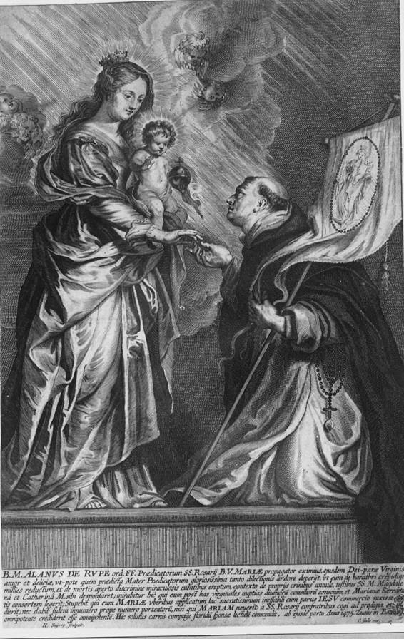 ZOJA RRUZARE DHE I LUMI ALANO I RUPES (Beatus Alanus de Rupe, B. Alain de la Roche) TREGIM ME IMAZHE ORIGJINA DHE PЁRHAPJA E RRUZARES QYTETET KU KA KALUAR I LUMI ALANO Imazhet e tё Lumit Alano i Rupes imazh i vogёl devocional ku paraqiten Shёn Domeniku (nё tё majtё, dallohet sepse atij Zoja i jep Rruzaren e shenjtё) dhe i Lumi Alano i Rupes (nё tё djathtё dallohet nga flamuri i Rruzares) dhe nё qendёr Zoja e Rruzares me Jezusin Fёmijё. Imazhi ёshtё i viteve tё para tё 1900-ёs. Printim i vitit 1650, ku dallohen shumё mirё I lumi Alano qё ujit pemёt e Rruzares dhe Shёn Domeniku qё mbjell tokёn. Pas tё Lumit Alano gjendet i Lumi Giacomo Sprenger, qё nё Köln themeloi Vёllazёrinё e Rruzares, qё duket sikur po mbledh frytet e Shёn Domenikut e tё tё Lumit Alano, dhe nga ana tjetёr gjithnjё duket Shёn Domeniku qё u shpёrndan Rruzare njerёzve qё i luten. Ky kopsht i mbyllur mirё, qё jashtё ka shumё pёrbindёsha, nga brenda pёrkundrazi hiri i Zotit, i Krishtit, i Shpirtit tё Shenjtё dhe i Virgjёrёs Mari janё dielli dhe shkёlqimi i tij. Harku triumfues i Cherascos (Cuneo), 1647-1688; detaj: statuja e tё Lumit Alano i Rupes. Falenderojmё Bruno di Cherasco qё na dha kёtё foto. Kisha e Shenjtёrve Agustin e Domenik, Recanati, Statuja e tё Lumit Alano i Rupes, shek. XVII. Falenderojmё priftёrinjtё qё na e dhanё kёtё foto. H. Snyers, Shfaqja e Zojёs tё Lumit Alano, gdhendje e gjysmёs sё parё tё shek. XVII Kupferstichkabinett, Dresden. Peter Paulus Rubens (1577-1640), Zoja Rruzare. Njё nga tre domenikanёt e pёrfaqёuar ёshtё i Lumi Alano i Rupes (dy tё tjerёt janё Shёn Domeniku dhe Shёn Pjetri Martir) Vendet mjaft tё ruajtura tё qytetit Zwolle nё Hollandё, ku i Lumi Alano i Rupes e mbylli jetёn e tij tokёsore. Sipas disa historianёve domenikanё, i Lumi Alano i Rupes qe dёrguar nё Zwolle vjeshtёn e mёparshme. Aty ngrihen muret e qytetit, menjёherё pas tё cilit gjendet konvikti i priftёrinjve dhe kisha e domenikanёve. Sot konvikti ёshtё njё shkollё muzike dhe kisha, e çshenjtёruar, shёrben si sallё koncertesh. Nё tё ёshtё i varrosur i Lumi Alano, poshtё dyshemesё sё kishёs, por se ku ekzaktёsisht nuk dihet. Mund tё mendojmё qё ndodhet aty ku ishte Alteri i Zojёs Rruzare. Dihet qё kisha pas vdekjes sё tij mori zjarr dhe pastaj nё nder tё tij u rindёrtua mё madhёshtore. ……………… Kisha e re e domenikanёve, pak jashtё qendrёs sё qytetit, u rindёrtua nё fillimet e shek. XX dhe aty tashmё duket sikur ёshtё zhdukur çdo kujtim i tё Lumit Alano. Stacioni i trenit ёshtё shumё pranё qendrёs sё qytetit Zwolle, me trena tё shpejtё, e lidhur shumё mirё me stacionet e ndryshme europiane. Ne shpresojmё qё kjo ish-kishё tё mund tё bёhet vend pelegrinazhi dhe tё nderohet kёshtu Recituesi mё i madh i Zojёs Rruzare, I LUMI ALANO I RUPES. |