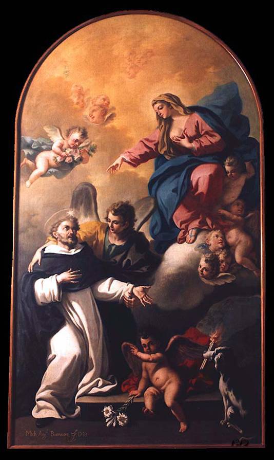 Michelangelo Bonocore, Virgjёra Mari i shfaqet Shёn Domenikut, pikturё vaji nё kanavacё, L'Aquila, Kisha e Shёn Domenikut (1733).