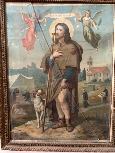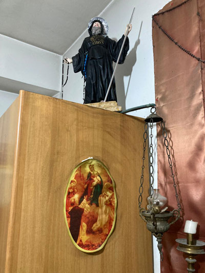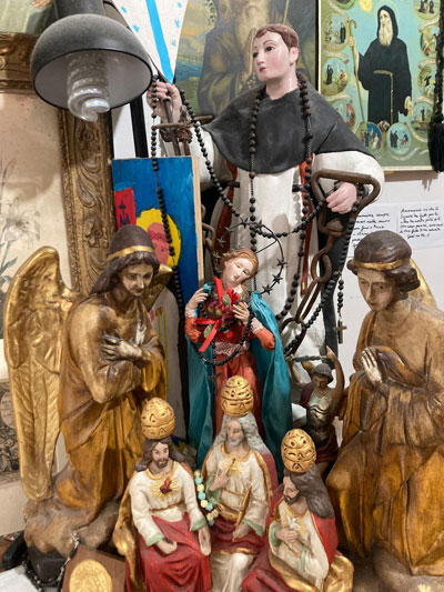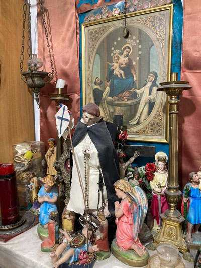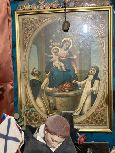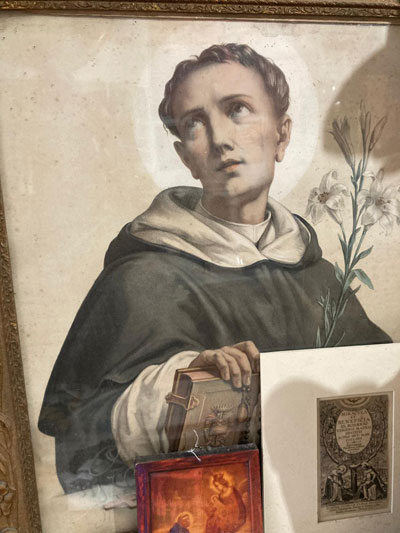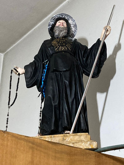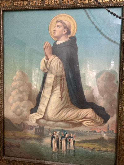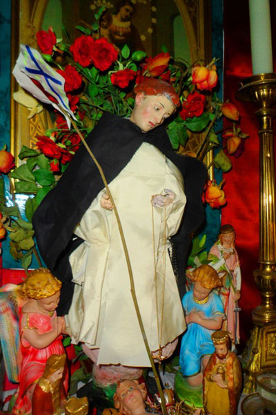 superiore, vi era un'antica statua di un Santo, vestito di bianco, con il saio domenicano: il volto era sui cinquant'anni, ma era smunto, i capelli erano corti e rossastri, aveva in una mano la Corona del Rosario e nell'altra portava uno Stendardo a forma di rombo che aveva una Croce azzurra e 15 stelline intorno, che gli occhi della statua guardavano intensamente.